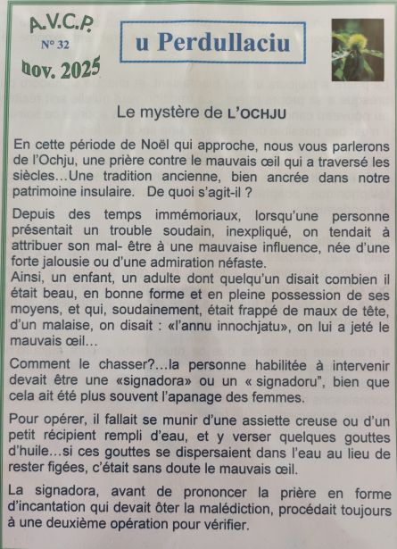 U Perdulacciu, Bulletin de l’association AVCP, créée le 2 juillet 2001 pour la sauvegarde de la chapelle dédiée à San Pancraziu, présidée par Marie-Léria Nicolaï, a été édité en novembre dernier. Il contient un remarquable article intitulé « Le mystère de l’ochju », une croyance qui existe et qui perdure dans toutes les sociétés du bassin méditerranéen.