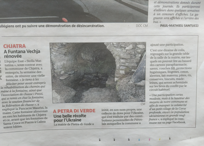 Le 20 avril 2022, Pietra achevait sa collecte au profit des ukrainiens. Un geste qui n’a pas échappé au quotidien Corse matin, qui informe régulièrement de la vie dans les villages. Sous le titre « Une belle récolte pour l’Ukraine », dans sa rubrique « A l’ACCORTA » (En bref), le quotidien insulaire a ainsi marqué la générosité des piétrolais pour la population ukrainienne en grande souffrance.