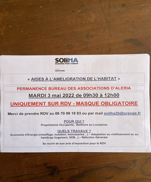 Mardi 3 mai 2022, se tiendra à Aléria, une permanence ayant pour objet, l’obtention d’aides à l’amélioration de l’habitat.
