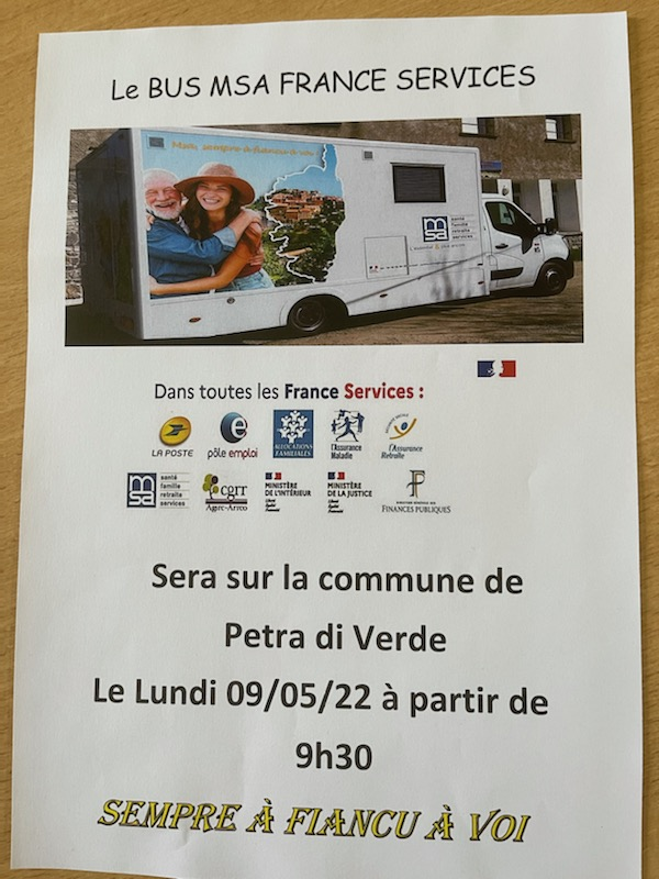Le bus avec un personnel qualifié sera le lundi 9 mai à Pietra, devant la mairie, à partir de 9h30 pour vous guider et vous assister dans vos démarches administratives.