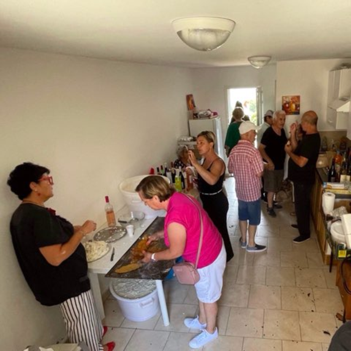 Eliane et Antoine remercient Toussaint et José qui ont exécuté toute les opérations de chauffage du four, préparation de la pâte, pétrissage, confection des migliacci et qui ont enfourné et sorti  pas moins de 1200 pièces.