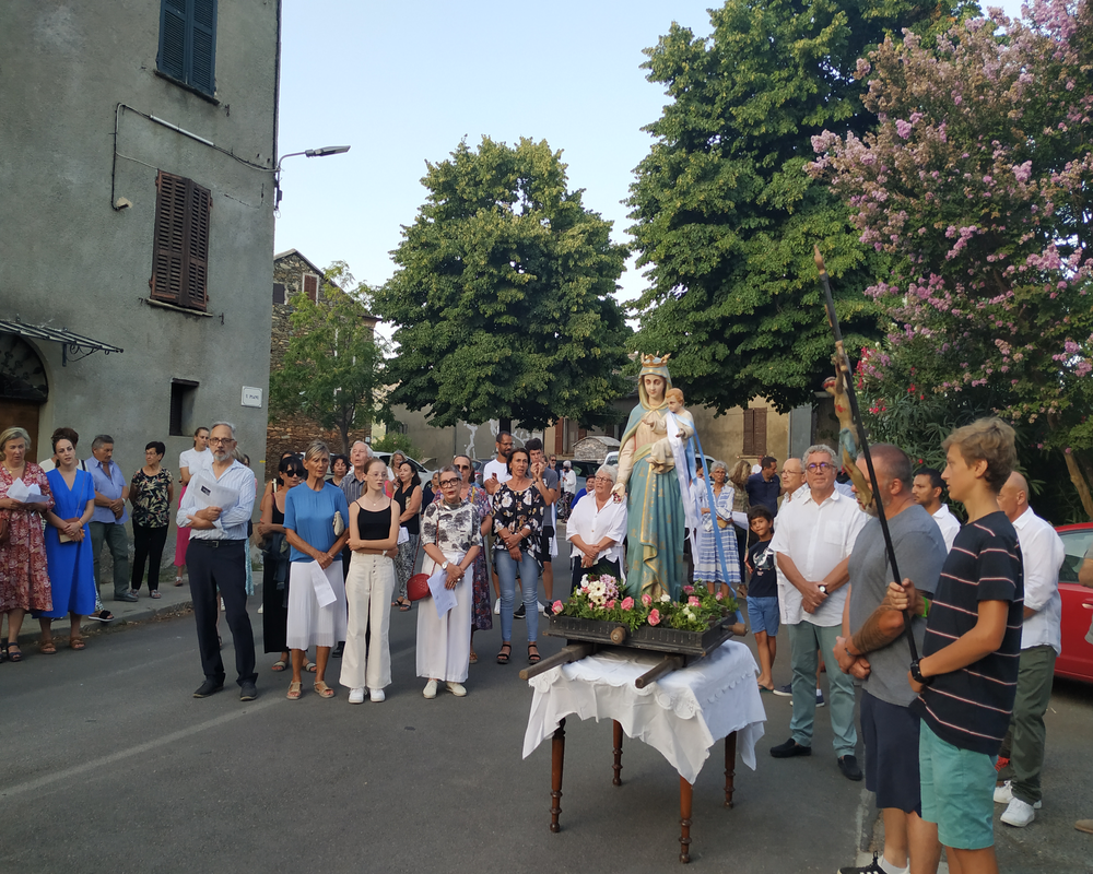 Un moment d’attente sur le parvis de l’église, puis le silence annonciateur de l’apparition de la Madone, dominant la foule du haut du brancard sur lequel elle a été fixée, pour être transportée à travers le village, un parcours en cinq stations, au cours desquelles se sont poursuivis chants et prières.